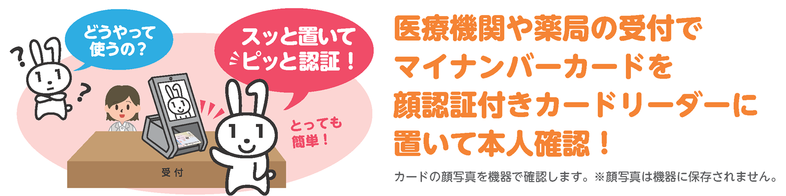 マイナンバーカードをお持ちの方で、まだ健康保険証としての利用登録を済まされていない方は、当院の受付に設置している顔認証付カードリーダーで、健康保険証として登録し、すぐにご利用いただけますので、ご不明な点等ございましたら、お気軽にスタッフにお尋ねください。